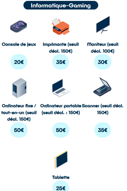 Tous les appareils qui figurent ci-dessous bénéficient du bonus à condition qu’ils ne soient plus couverts par une garantie et que la panne soit éligible.